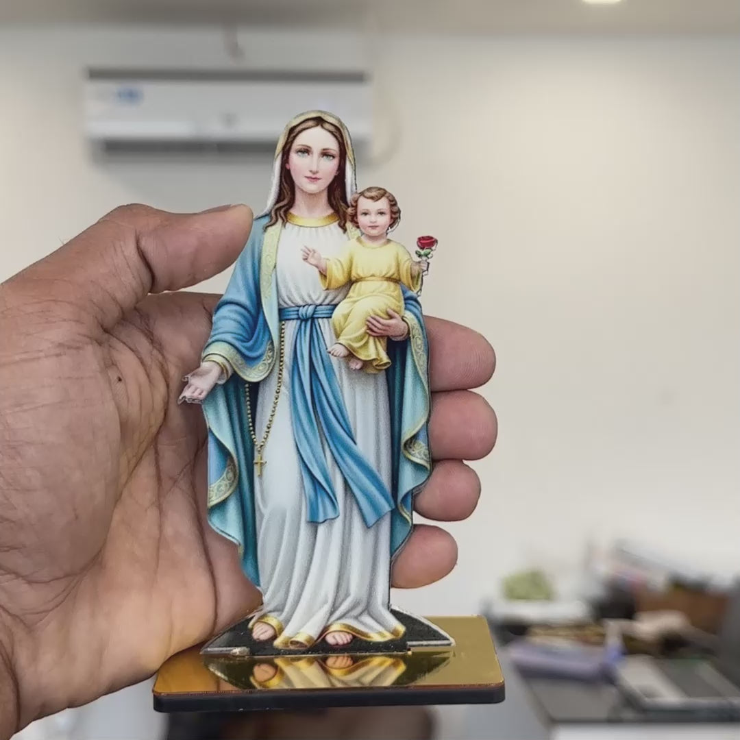 This graceful statue of Mother Mary holding Baby Jesus is beautifully printed on premium acrylic, perfect for your home altar, office desk, or car dashboard. A symbol of love, care, and divine blessing, this piece adds peace and serenity to any space. It is a meaningful gift for family and friends to share faith and devotion.